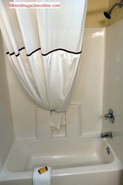 A footstool near the chair proved useful, and the side table was a big plus, especially for eating and working—something not always well considered in standard hotel rooms. Electrical outlets and USB ports were located near the bed, though the USB ports unfortunately did not function. The TV remote was simple and user-friendly, and a printed channel list was provided. While there were no premium movie channels or MeTV, the basics were sufficient for a short stay.The in-room microwave featured old-school analog dials, which was a unique and slightly nostalgic touch. The refrigerator was larger than expected, another welcome surprise. The bathroom was clean, though there was a minor repair visible on the shower wall. Interestingly, the front desk clerk shared that while the property looks fairly new, it is actually around 20 years old—a testament to consistent upkeep. An ice machine and trash receptacle were located just outside my third-floor room, making things especially convenient.